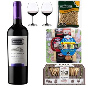 Vino 375 ml, Tostadas, Hummus, Mani, Surtido Serrano, Frutas y Queso